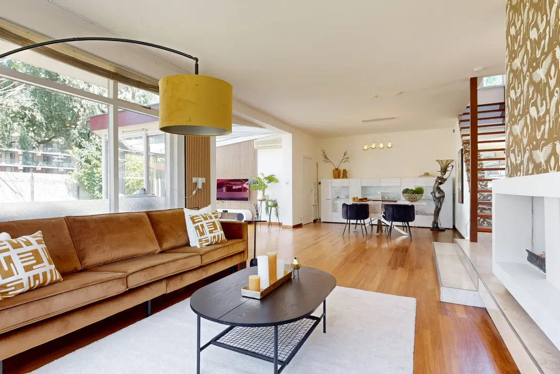 Through the spacious entrance with French doors, you enter the cozy living room, which flows seamlessly into a bright space thanks to the conservatory. The generous seating area with a fireplace and the inviting dining space make this the perfect place to gather.