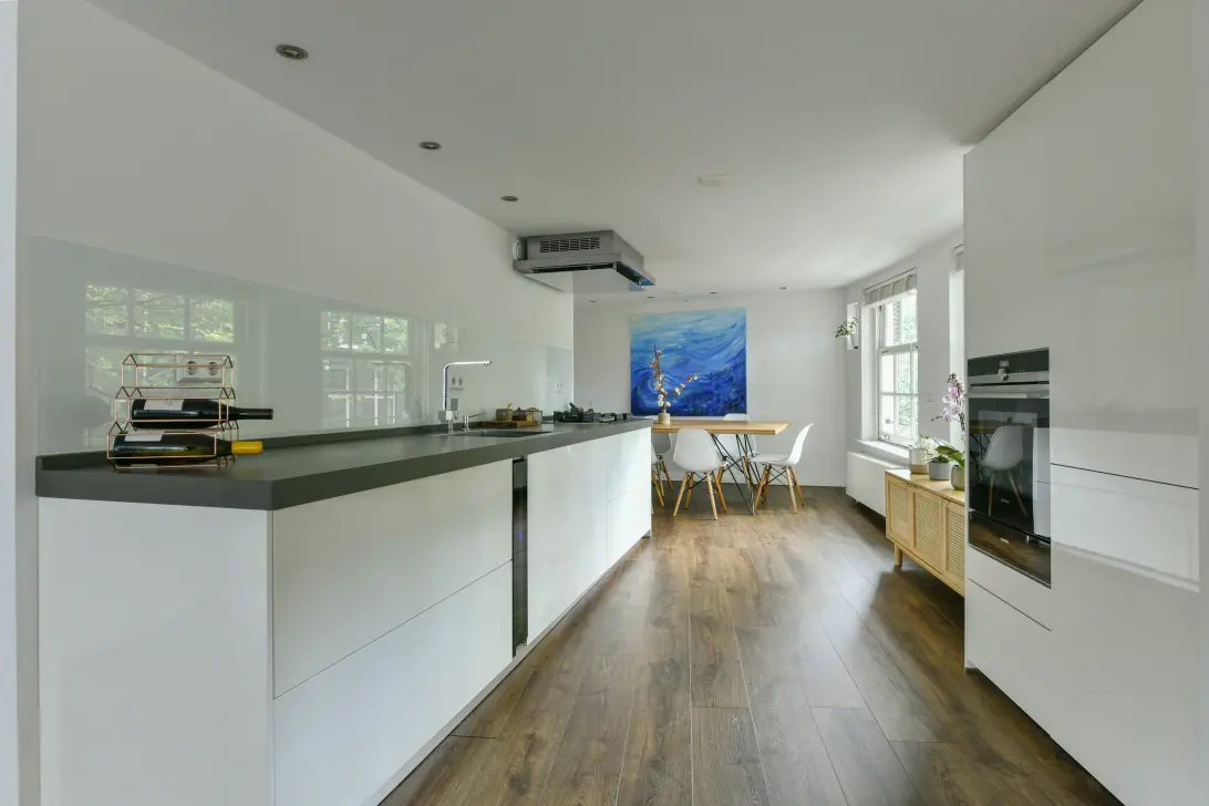 De keuken heeft een composieten werkblad met rvs spoelbak (met ingebouwde zeeppomp), een 5-pits gaskookplaat van Atag met een afzuigkap, vaatwasser, koelvries-combinatie (allen van Siemens), een warmhoud-lade en een wijnklimaatkast. Open eetkamer met ramen aan de Krom Boomssloot. Kast met cv installatie 2016 en aansluiting wasmachine.
