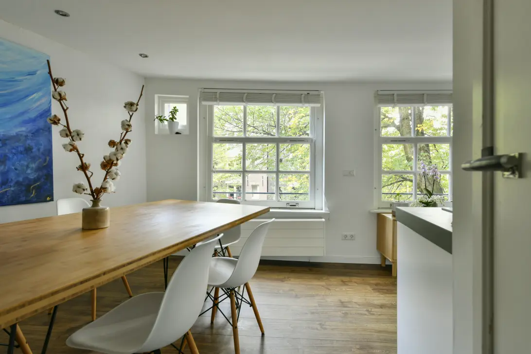 Gelegen op de tweede en bovenste verdieping en dankzij de hoekligging beschikt het appartement over ramen aan zowel de Krom Boomssloot als de Dijkstraat. De vele ramen op het zuiden zorgen voor een prachtige lichtinval: dit is een heerlijk licht en sfeervol huis waar je je meteen thuis voelt.