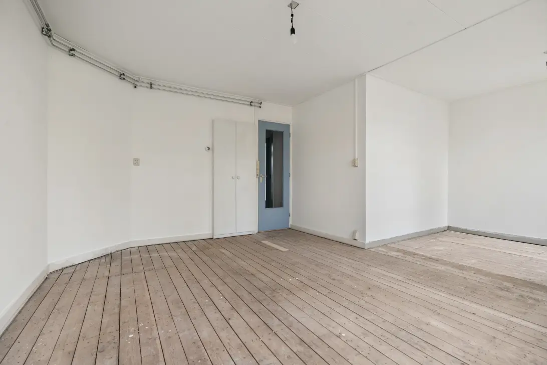 Entree; hal met aan de linkerzijde de ruime en lichte woonkamer in L-vorm. Aan de achterzijde van het appartement de slaapkamer met openslaande deuren naar het balkon, en de keuken met standaard keukenblok met toegang tot het balkon. De badkamer is voorzien van een douche, toilet, wastafel en de opstelplaats voor de wasmachine.
