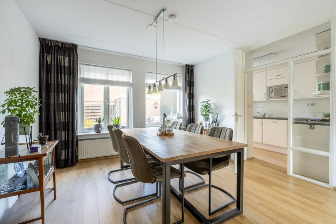 Je komt binnen in de lichte hal met meterkast, trapopgang en een keurig toilet. Vanuit daar stap je de sfeervolle woonkamer in, waar het daglicht royaal binnenvalt via de grote ramen aan de voorzijde. De zithoek is ruim en gezellig, met zicht op het water. Achterin vind je een fijne eethoek die naadloos aansluit op de keuken. Deze dichte keuken is compleet uitgerust met onder andere een gaskookplaat, oven en veel opbergruimte. Extra fijn: de handige bijkeuken met achterdeur naar buiten. Ideaal voor was, voorraad of een kinderwagen.
