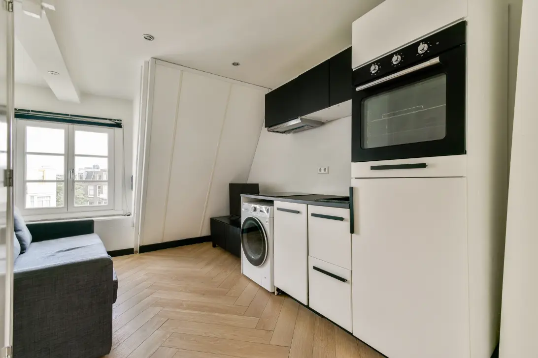 De woning bevindt zich op de zolderverdieping, zonder bovenburen. De sfeervolle woonkamer met open keuken voelt warm en gezellig aan. Dankzij de schuine kap, zichtbare balken en slimme indeling is elke vierkante meter optimaal benut. De keuken is modern en compleet uitgerust met onder meer een kookplaat, afzuigkap, koelkast en wasmachine.