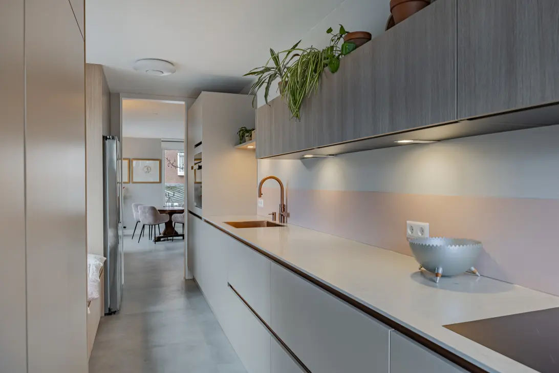 De keuken is zonder twijfel het pronkstuk van de woning. Deze luxe keuken uit 2025 is uitgevoerd in twee rechte opstellingen met taupekleurige kasten en een prachtig natuurstenen werkblad. Hoogwaardige apparatuur zoals een BORA kookplaat met geïntegreerde afzuiging, Siemens Studioline oven en vaatwasser, een strakke koperkleurige spoelbak met een Quooker (3-in-1 flexkraan) en zeedispenser en een LG koelkast met water- en ijsdispenser maken koken hier een beleving. Uniek is de op maat gemaakte zitbank tussen de kasten, met extra bergruimte eronder – een heerlijke plek om te lezen, te borrelen of simpelweg te genieten van het uitzicht. Daarnaast is er een slim weggewerkte thuiswerkplek achter kastdeuren: werken en wonen vloeien hier moeiteloos samen.