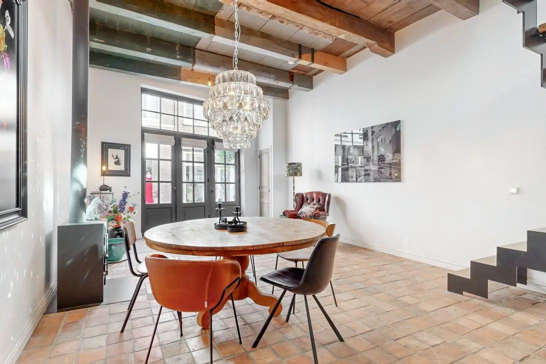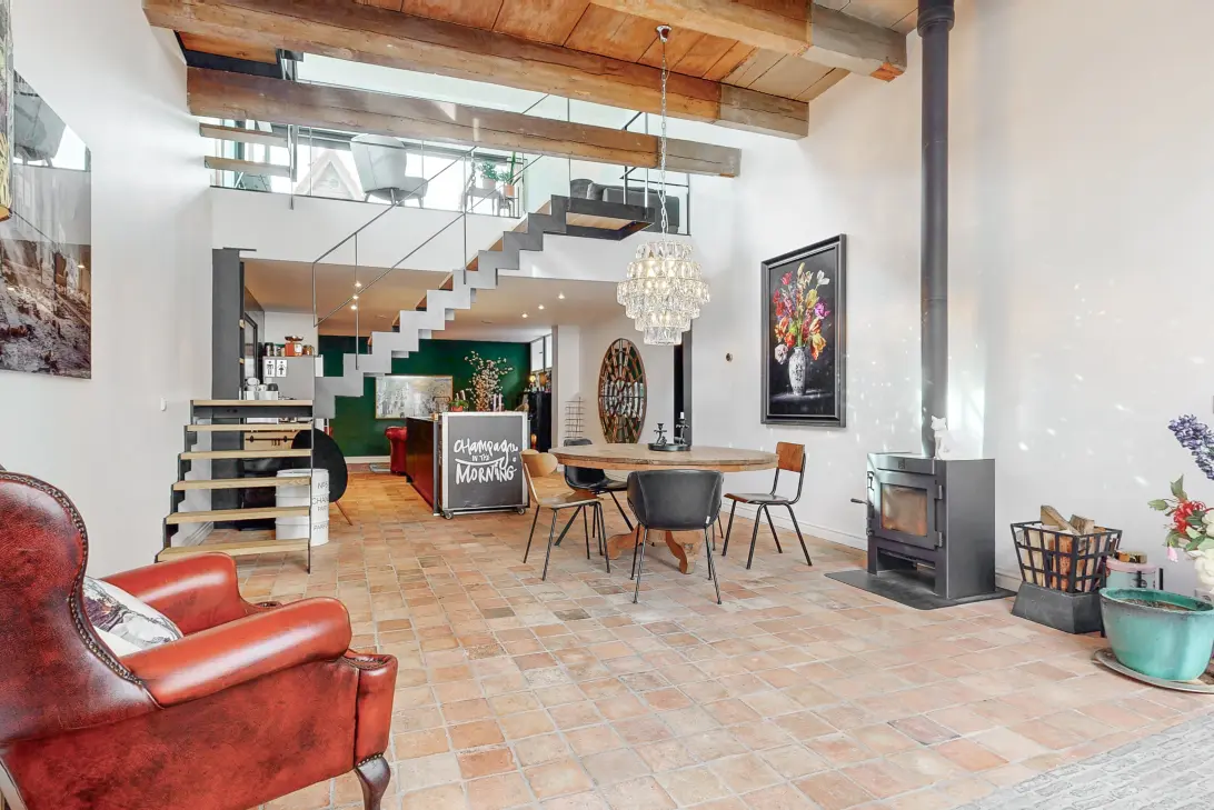 Je betreedt de woning op straatniveau in de ruim opgezette, gezellige woon-/leefkeuken. Deze sfeervolle ruimte met een authentieke Franse estrikken vloer is voorzien van een modern kookeiland met inbouwapparatuur van hoogwaardige kwaliteit. Opvallend detail is dat de achterwand bekleed is met handgemaakte metallic witjes van Piet Jonker. Deze geven de keuken een uniek karakter. De strakke stalen houtkachel van Dirk Geurts maken de ruimte de perfecte plek voor gezellige etentjes. De mooie hoogte en het authentieke plafond zorgen voor een ruimtelijke beleving. De eyecatcher in deze ruimte is de op maat gemaakte stalen trap die als een ader door de woning loopt. Hier wordt modern stijlvol gecombineerd met historische details.