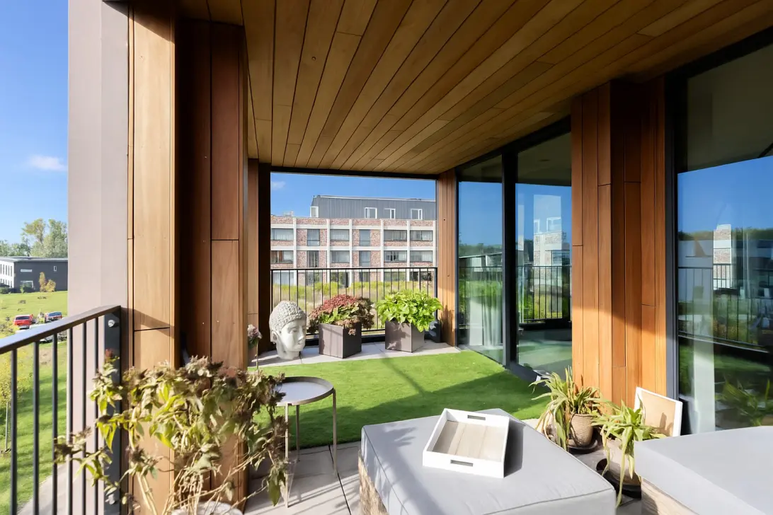Het is heerlijk comfortabel wonen door o.a. de grote glazen puien, de goede isolatie, comfortabele vloerverwarming en de hoge plafonds. Het terras (loggia) van 20 m² is op het gunstige zuidwesten georiënteerd. Vanuit het appartement en vanaf het terras is er prachtig zicht op de omgeving.
