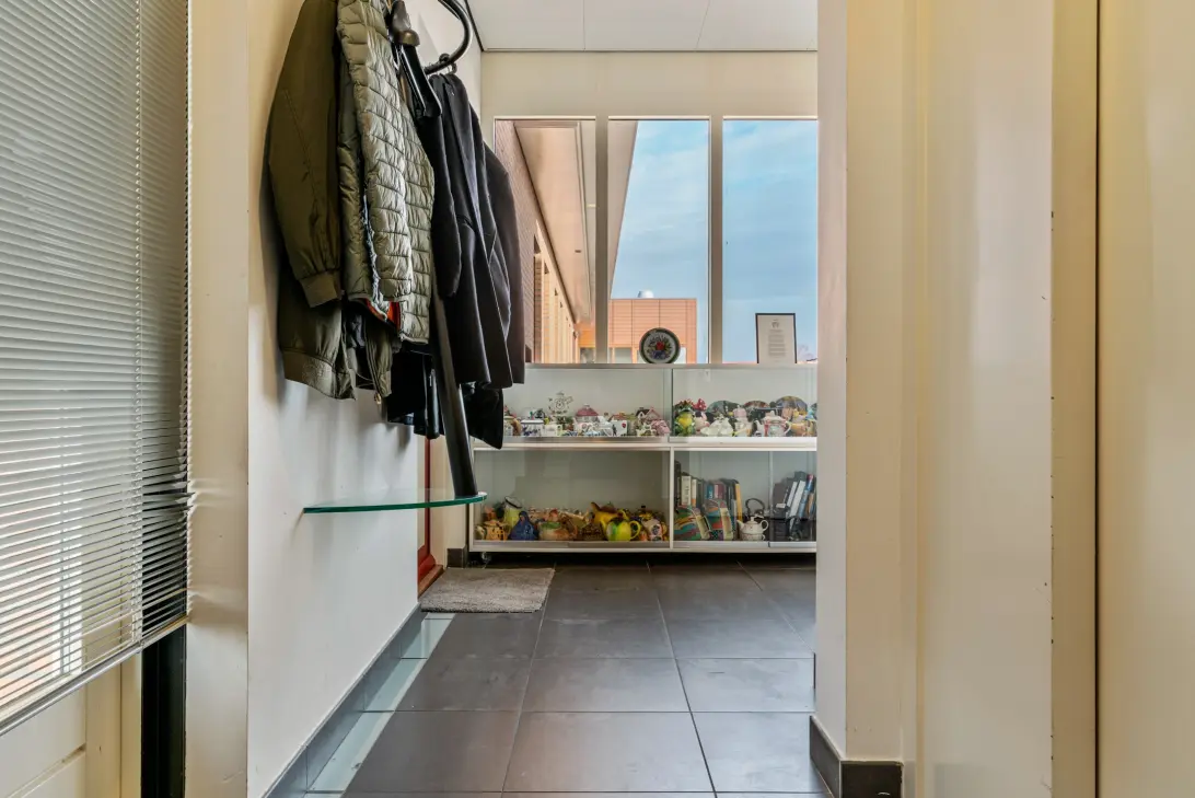 Met de lift bereikt u de tweede, tevens hoogste verdieping. U komt hier uit in een algemene gang, welke uitsluitend toegang geeft tot het penthouse. Via de entree betreedt u de woning via de hal, waar zich het separate toilet bevindt en toegang is tot de praktische berging met aansluitingen voor wasmachine en droger. Vanuit de hal loopt u door naar het leefgedeelte van de woning.