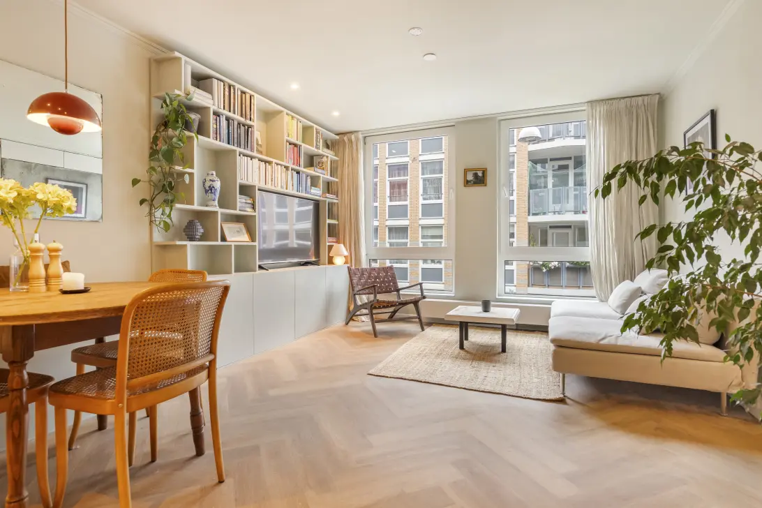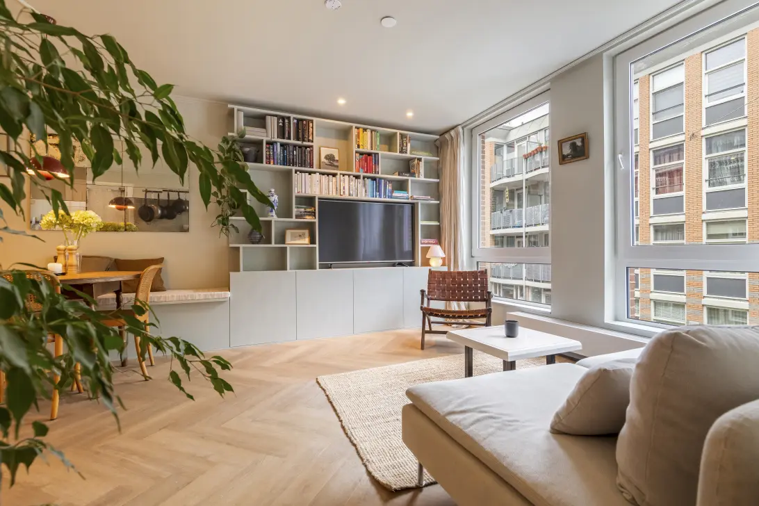 Bij binnenkomst stap je gelijk de lichte woonkamer, waar grote ramen voor een vriendelijke, open sfeer zorgen. De woonkamer is slim ingericht met een comfortabele zithoek en ingebouwde kasten die zowel rust als functionaliteit brengen.