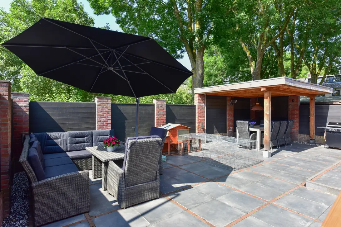 In de fraai aangelegde ruime tuin (achter- en zijgedeelte, tevens een voortuin) is een heerlijke overkapping geplaatst. Aan de zijkant van de woning is een praktische stenen berging gerealiseerd. De hele zij- en achtertuin is afgeschermd middels een onderheide tuinmuur met schermen geplaatst tussen de gemetselde penanten met verlichting.