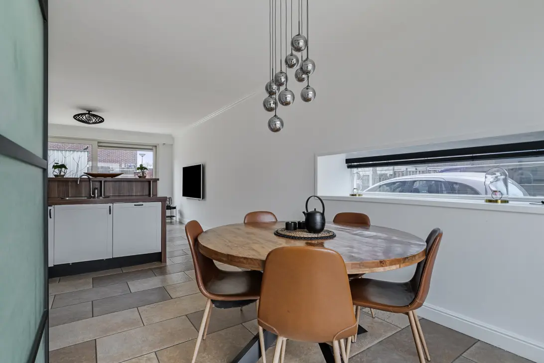 De nette keuken, in halfopen verbinding met de woonkamer, is uitgerust met diverse inbouwapparatuur, waaronder een koelkast, vriezer, oven, aparte magnetron, vaatwasser, 5-pits gaskookplaat en afzuigkap. Via een royale schuifpui in de woonkamer bereikt u de strak aangelegde, onderhoudsvriendelijke achtertuin.