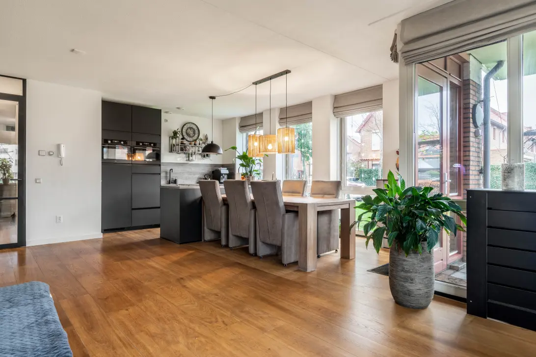 Via de privéopgang komt u in de ruime hal die toegang biedt tot alle vertrekken van het appartement. Er is een royale garderobe, een separaat toilet, een meterkast en toegang tot de woonkamer. De woonkamer is gelegen aan de achterzijde van het complex en is door de vele ramen heerlijk licht. Bovendien geniet de woning van een fraai open uitzicht. De keuken is in 2022 vernieuwd en beschikt over diverse inbouwapparatuur, zoals een combi oven, combi stoomoven, koelkast en vaatwasser. Het kookeiland is uitgerust met een 4-pits inductiekookplaat van Bora. De keuken biedt voldoende opbergruimte en werkruimte om met plezier maaltijden te bereiden. Het terras, dat via de woonkamer bereikbaar is, ligt op het noordwesten zodat u volop van de avondzon kunt genieten.