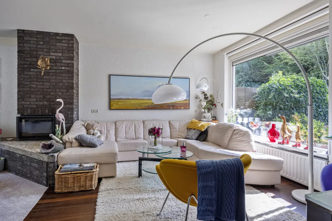 De woonkamer biedt, dankzij de L-vorm, ruimte aan een dubbele zithoek en een ruim eetgedeelte. Er ligt parket op de vloer, bij het eetgedeelte zie je een grote kastenwand en de gemetselde schouw met inbouwhaard is een echte blikvanger in huis. Als de haard aan staat, is de woonkamer al snel warm waardoor er geen gasverbruik is. Bij het eetgedeelte is een deur naar de wijn-/provisiekelder, die onder de bordestrap en de toiletruimte is.
