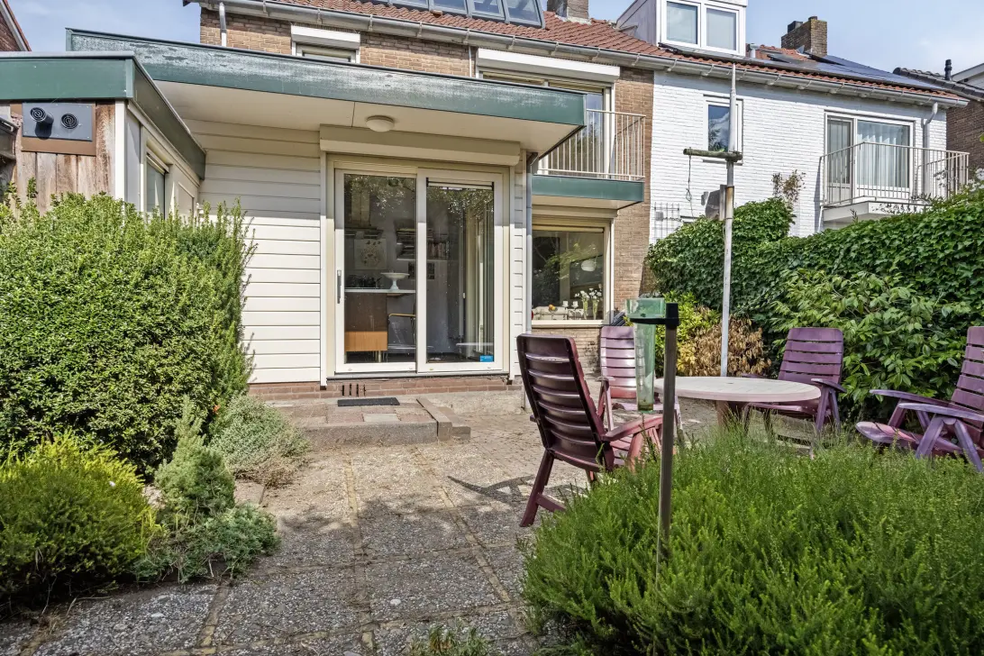 Vanuit de keuken loop je de achtertuin in, die net als het balkon op het zuidwesten is. Het grote terras biedt een fijne zitplek, en aan drie kanten zie je beplanting waardoor er veel privacy in de tuin is. Ook in de voortuin zie je veel groen, deels groenblijvend, en er is parkeergelegenheid op eigen terrein.