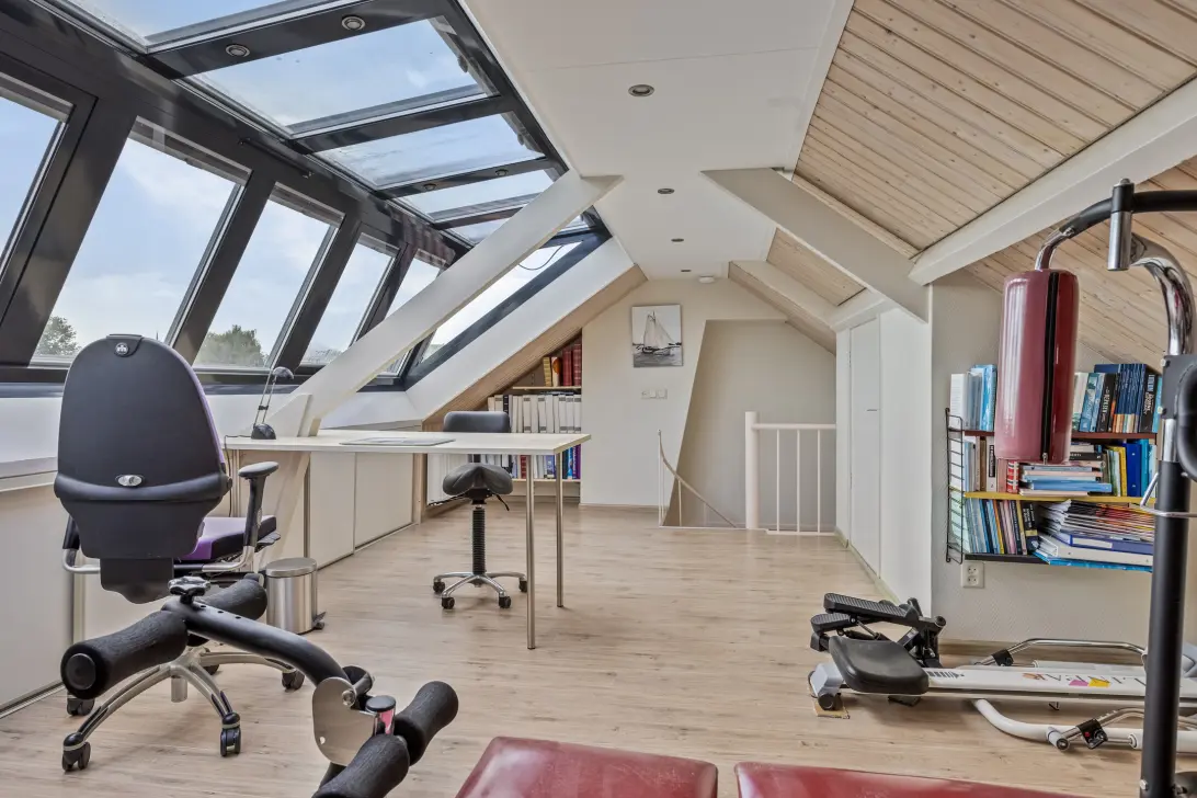 Iedereen kent een dakkapel, maar een dakserre is minder bekend. Op de tweede verdieping zie je zo’n dakserre, met vele grote ramen waardoor het dag- en zonlicht naar binnen valt. Het resultaat is dat er op deze verdieping een grote, multifunctionele ruimte is die nu als sport- en hobbyruimte in gebruik is. Bergruimte is er ook, in de schuinten van het dak.