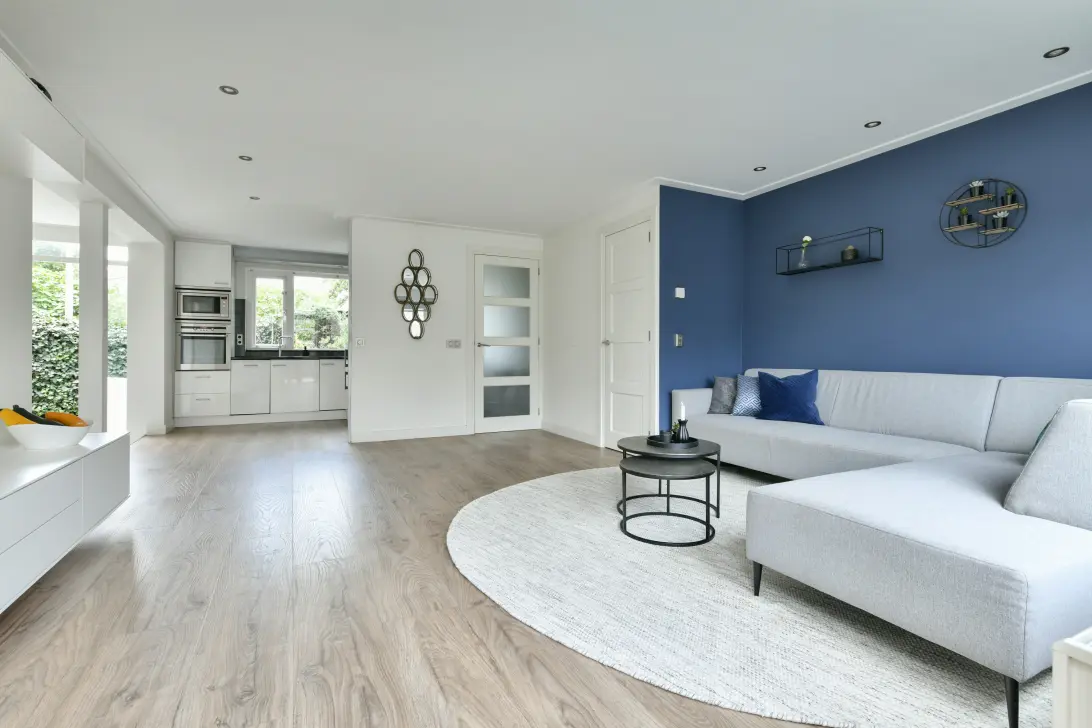 De ruime woonkamer, met moderne open keuken aan de voorzijde, heeft toegang tot de achtertuin.