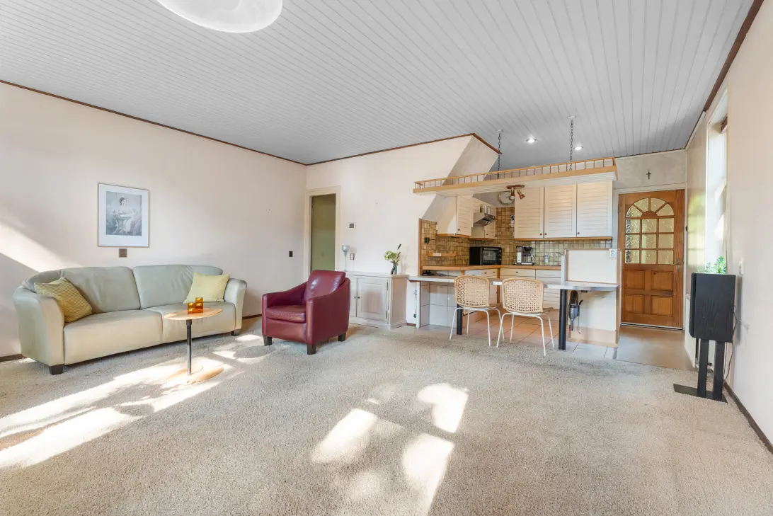 Direct bij binnenkomst kun je ook doorlopen naar de open keuken, die centraal aan de zijkant van de woning ligt. Deze is voorzien van diverse apparatuur, maar verdient een opknapbeurt. Aangrenzend bevindt zich de lichte woonkamer, met drie grote ramen die zorgen voor veel daglicht en een mooi uitzicht op de laan met oude eikenbomen.