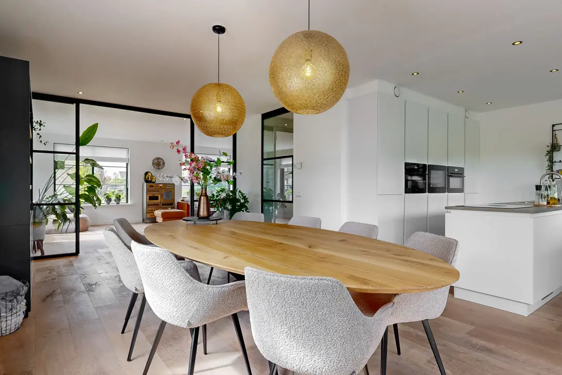 Begane grond: ruime hal, een toilet met fontein en een fraaie stalen taatsdeur naar de sfeervolle woonkamer. Hier zorgen een prachtige raftwood eiken vloer, strak gestucte wanden en plafonds en stalen en-suite deuren voor een moderne uitstraling. De keuken is een droom voor kookliefhebbers: een royaal kook- en spoeleiland, grote koelkast en vriezer, vaatwasser, Quooker, twee combi-ovens, een wijnklimaatkast en een Bora-kookplaat. Vanuit de keuken leiden dubbele deuren je direct naar de tuin. De aangebouwde garage, eveneens voorzien van vloerverwarming, biedt plaats aan de wasmachine en extra bergruimte.