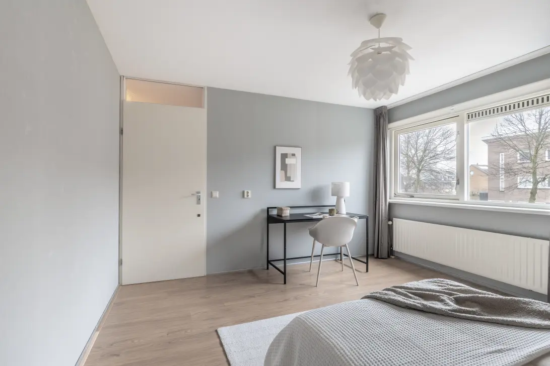 Ruime overloop met toegang tot drie slaapkamers en de badkamer. De badkamer is in 2020/2021 volledig vernieuwd en uitgevoerd in een moderne stijl met rustige grijze tegels en fraaie verlichting. De badkamer is voorzien van een ligbad met whirlpoolfunctie, een wastafelmeubel, een ruime douche met dubbele douchekop en een toilet. De eerste slaapkamer bevindt zich aan de voorzijde en is van goed formaat, met voldoende ruimte voor een groot bed en een kledingkast. De tweede ruime slaapkamer ligt aan de achterzijde. Ook de derde slaapkamer bevindt zich aan de achterzijde en beschikt over een ingebouwde kast voor extra opbergruimte en een deur die toegang biedt tot het dakterras. Het ruime dakterras is een extra pluspunt van deze woning en biedt volop ruimte voor een gezellig zitgedeelte.
