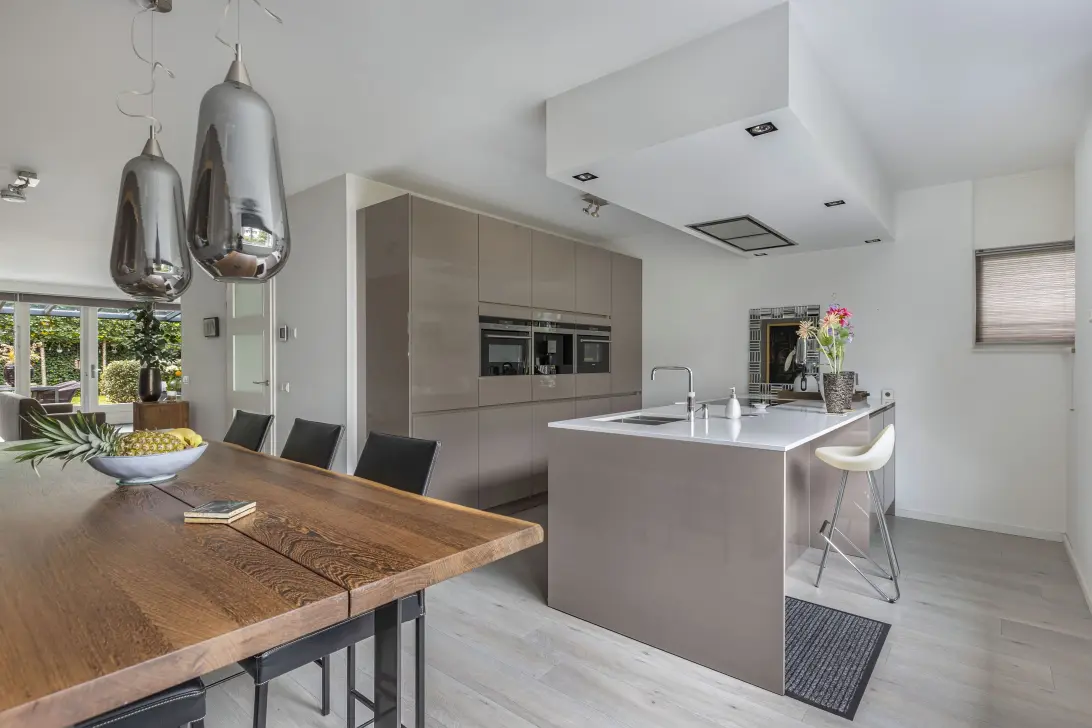 Binnenkomst in een ruime hal met meterkast en alarmsysteem, modern toilet met fonteintje en een bergkast met de warmtepomp voor verwarmen én koelen. De royale living heeft een open haard en openslaande deuren naar de zonnige achtertuin met overkapping en inbouwzonnescherm. De sfeervolle Siematic-woonkeuken is uitgerust met luxe inbouwapparatuur (o.a. koffiezetapparaat, Quooker, vaatwasser, koelkast, combi-oven en stoomoven) en biedt plaats voor een grote eettafel de perfecte plek om samen te komen.