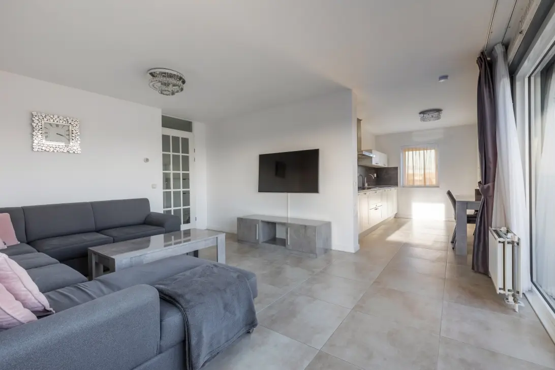 Adjacent to the living room is the modern kitchen, fully equipped with, among other things, a dishwasher, four-burner induction cooktop, extractor hood, fridge-freezer combination, and oven. The kitchen is smartly laid out and offers ample storage space.