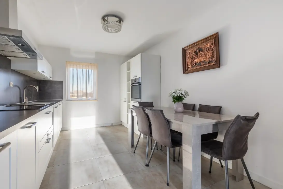 Aansluitend aan de woonkamer vindt u de moderne keuken, volledig uitgerust met onder andere een vaatwasser, vierpits inductiekookplaat, afzuigkap, koel-vriescombinatie en oven. De keuken is slim ingedeeld, waardoor er volop opbergruimte is.