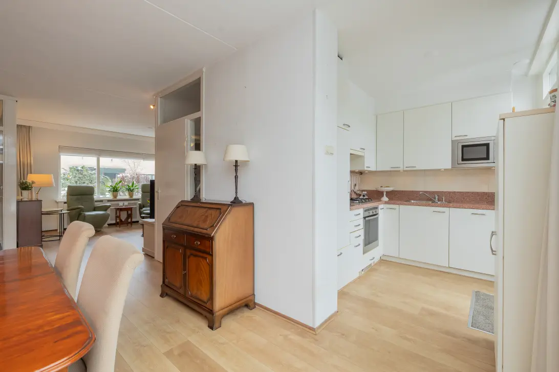 De gemoderniseerde keuken is voorzien van diverse inbouwapparatuur, plint/ heteluchtverwarming en biedt volop comfort voor dagelijks gebruik en heeft eveneens toegang tot de tuin — praktisch en prettig in gebruik.