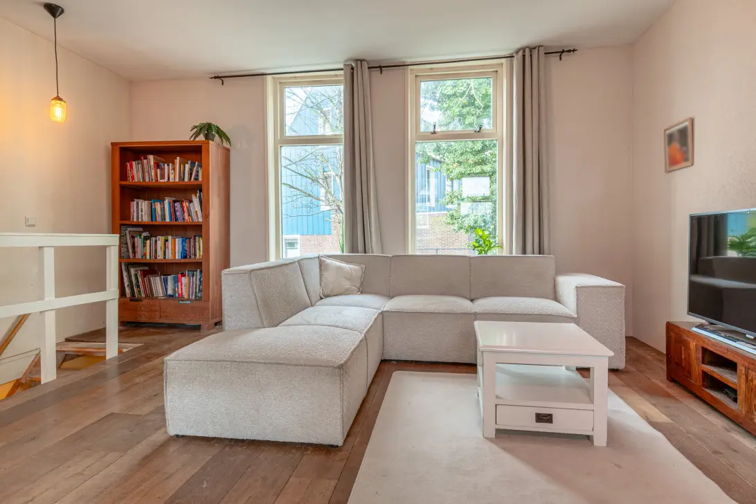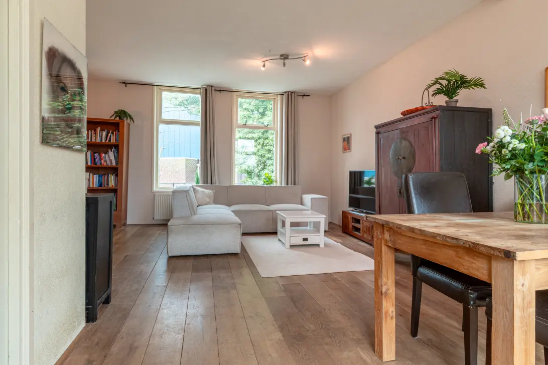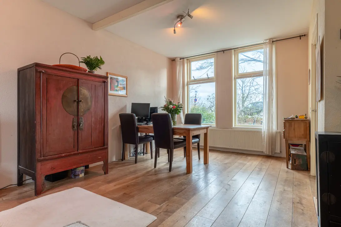 Via het dijkniveau betreed je de woning. In de hal met trapopgang word je direct welkom geheten en loop je door naar de sfeervolle woonkamer. Hier is volop ruimte om te ontspannen. De grote raampartijen zorgen voor veel lichtinval en bieden een prachtig uitzicht op de Lage Horn, een van de meest karakteristieke plekken van Zaandam.
