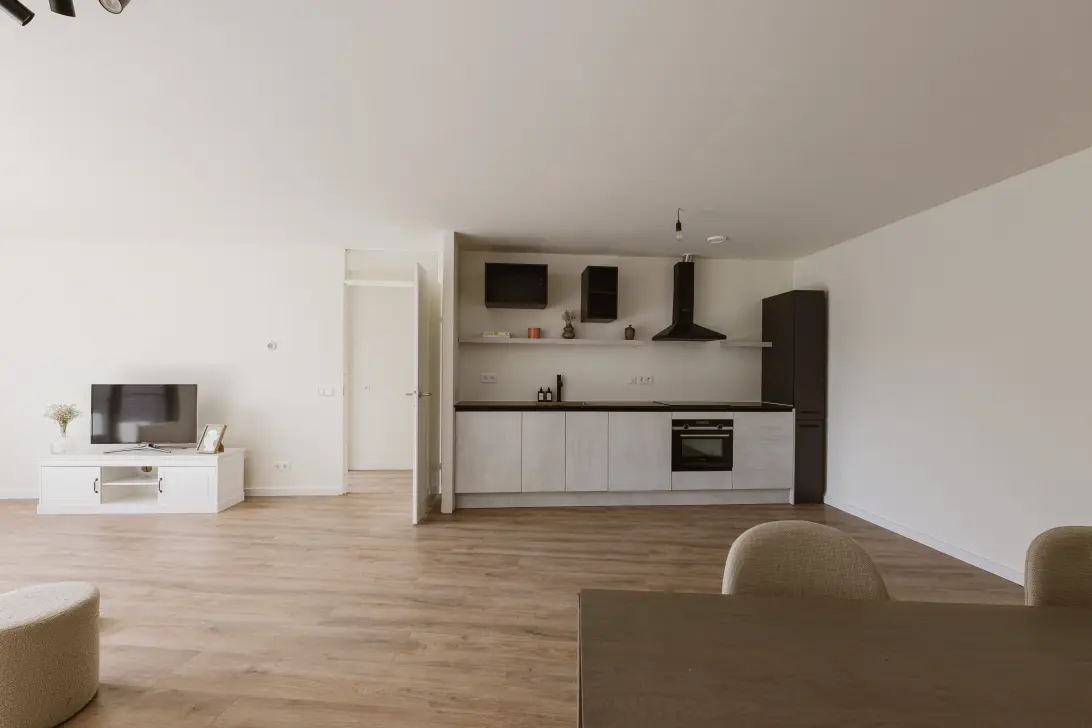 The walls have a neutral finish, making it easy to adapt the interior to your personal style. A well-maintained laminate floor runs throughout the entire apartment, creating a calm and cohesive atmosphere.