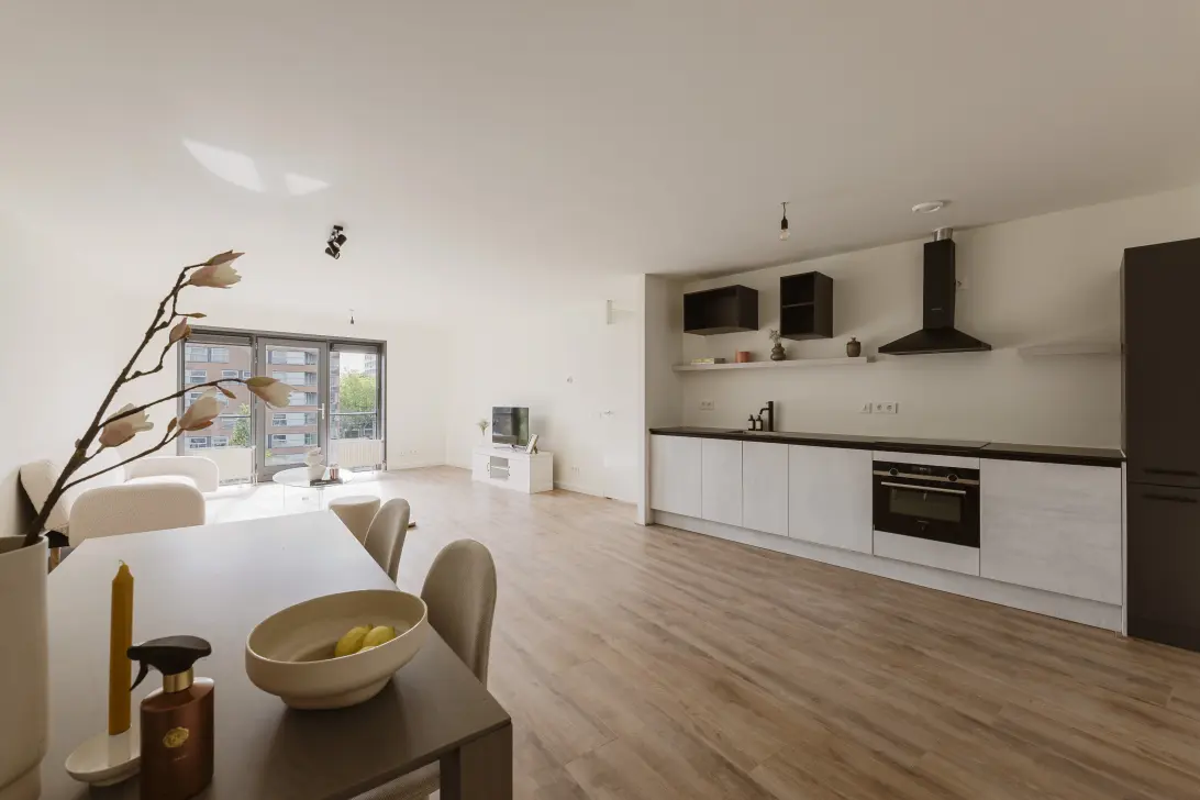 De moderne open keuken is uitgevoerd in een rechte opstelling met voldoende werk- en bergruimte. De keuken beschikt over hoogwaardige inbouwapparatuur (Siemens), zoals een inductiekookplaat, combimagnetron/oven, koelkast, vaatwasser, zwarte kraan en spoelbak – alles gloednieuw.