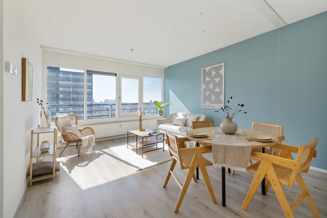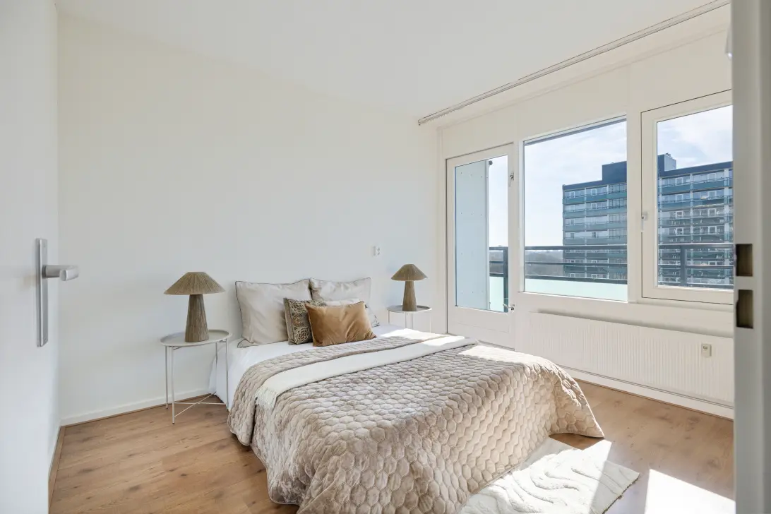 Dankzij de grote ramen is het appartement heerlijk licht en voelt het ruim aan. De woonkamer is een fijne plek om te relaxen, te werken of vrienden te ontvangen. Vanuit hier stap je zo het zonnige balkon op het zuiden op – ideaal voor een kop koffie in de ochtend of een drankje na werk, met vrij uitzicht over de stad.