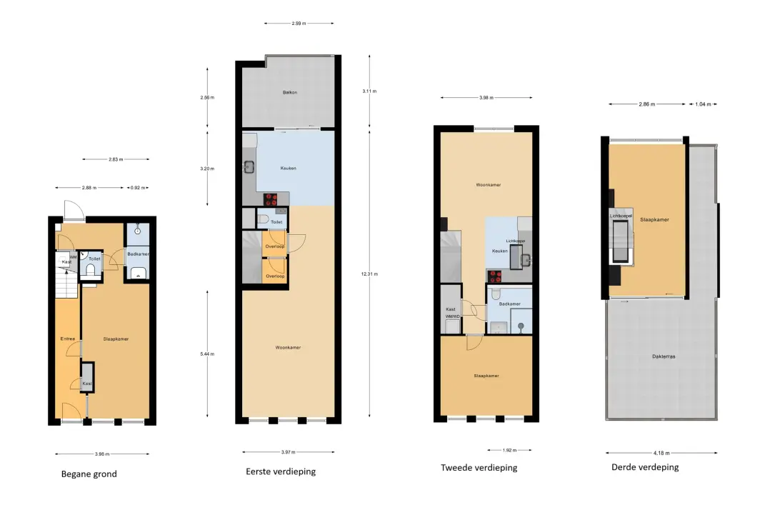 Een ruim woonhuis verdeeld over vier woonlagen met een speelse indeling. Ideaal zijn bijvoorbeeld de vele slaapkamers, waarvan een op de begane grond, een of twee op de tweede verdieping en nog eens een derde op de bovenste verdieping met dakterras.