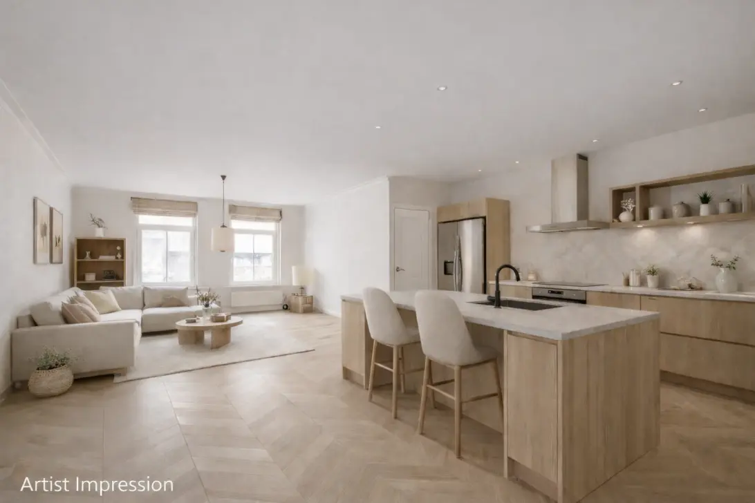 Ruime en lichte woonkamer met schouw en toegang tot de open woonkeuken in L-opstelling met Amerikaanse koel-vriescombinatie en vaatwasser.