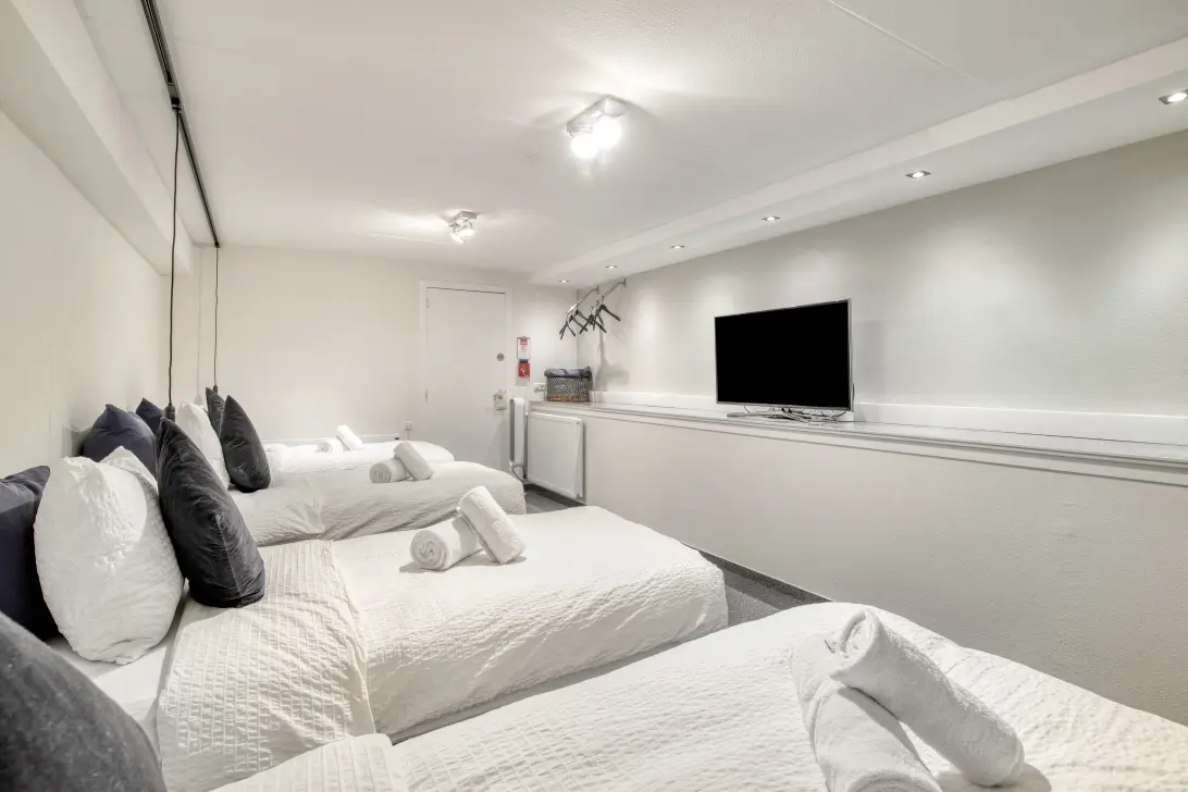 U komt binnen via uw persoonlijke entree op de begane grond met in de vestibule de afsluitbare trap naar het Guesthouse in het sous met een industriële grint vloer met comfortabele cv-verwarming. Hier treft u allereerst de kitchenette, ingenieus verscholen achter gesloten deuren die eenvoudig te openen zijn tot een volwaardige woonkeuken. Dit keukenblok is stijlvol gebouwd met witte greeploze kastdeurtjes, een granieten werkblad, een 4 pits inductiekookplaat met afzuigkap, een ijskast met vriesvak en natuurlijk een afwasmachine. De strakke badkamer is voorzien van stemmig antracietkleurige plavuizen en fris witte tegels met een inloopdouche met hardglazen douchedeur, een hangend closet, een handdoekenradiator en een trechtervormige witte design wastafel. De achterliggende slaapruimte, met ruimte voor 4 queen-sized bedden, is royaal en rustig gelegen in de buik van het huis. En voor uw gemak is er een centraal stofzuigersysteem voor beide verdiepingen.