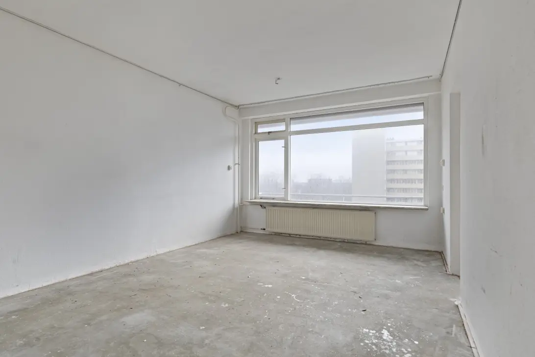 De ruime woonkamer biedt toegang tot een slaapkamer aan de achterzijde, voorzien van praktische inbouwkasten. Vanuit deze slaapkamer zijn zowel de badkamer als het zonnige balkon bereikbaar. Het balkon is op het zuiden gelegen en biedt een vrij en groen uitzicht.