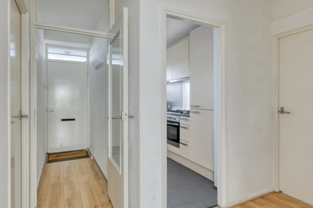 Entree tot het appartement op de 6e verdieping middels de lift (of trap): hal en gang met garderobemogelijkheden, bergkast, meterkast en toiletruimte.