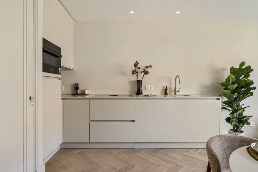 De nieuwe keuken met composiet blad is volledig uitgerust met moderne Siemens-inbouwapparatuur, waaronder een Quooker, vaatwasser, koelkast met vriezer, combi-oven en een inductiekookplaat met geïntegreerde afzuiging. Via de gang bereik je de slaapkamer, die ruim is opgezet en eveneens beschikt over een groot raam. De badkamer is ontworpen in een eigentijdse stijl met hoogwaardige Hotbath-kranen en is voorzien van een inloopdouche, vloerverwarming en een fraai composiet wastafelmeubel. In de gang bevindt zich bovendien een separaat toilet, en het appartement beschikt over een ingebouwde was-droogcombinatie.