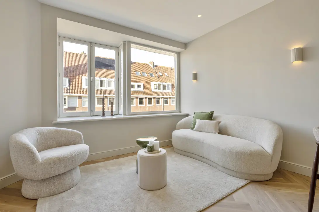 Via een verzorgd trappenhuis bereik je het appartement op de tweede verdieping. Het is recent volledig gerenoveerd en heeft een moderne, strakke en stijlvolle afwerking. Bij binnenkomst kom je direct in een lichte, open leefruimte met een grote raampartij aan de voorzijde. Hier is een gezellige zithoek te creëren en een nis bij de ramen, die open kunnen en veel daglicht binnenlaten.