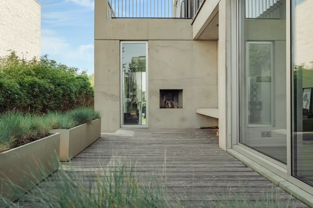 - Double-sided indoor/outdoor fireplace sharing a single flue, integrated into the concrete façade.