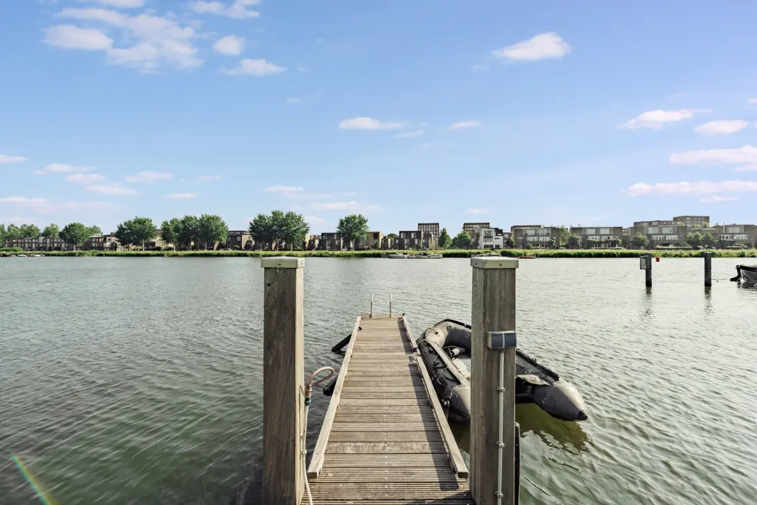 Stap binnen in de woonkamer, waar grote ramen/schuifdeuren zorgen voor een overvloed aan natuurlijk licht. In de zomer schuifdeuren open en ultiem genieten! Grote achtertuin aan het dijklichaam met aansluitend je eigen steiger voor je boot. Zwemmen, schaatsen, suppen noem het maar op, hier kan het allemaal. Goed gebouwd, beton, glas en staal, een must see!