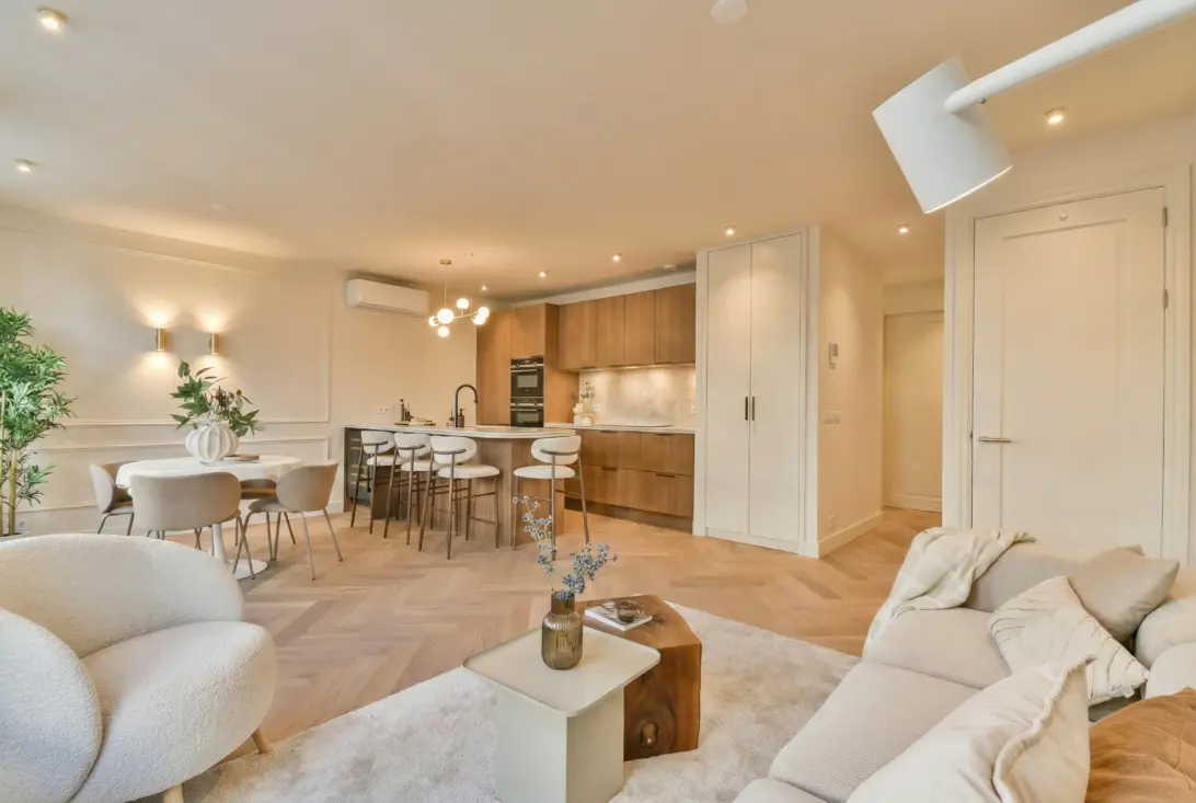 - Door het gehele appartement ligt een fraaie houten visgraat parketvloer