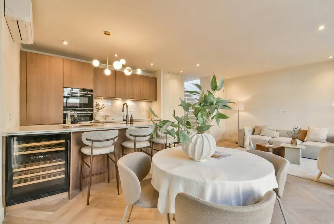 Hallway providing access to all rooms. Spacious and bright living and dining area with a stylish open kitchen at the front, featuring a sink island and high-end built-in appliances. Master bedroom at the rear with custom-built wardrobes. Second spacious bedroom also at the rear. Both bedrooms have access to a sunny balcony with beautiful views over the rear inner gardens. Luxurious bathroom with a large walk-in shower and custom-made washbasin unit. Separate toilet accessible from the hall. Storage closet with washing machine and dryer connections. Throughout the apartment, there is elegant herringbone wooden parquet flooring with underfloor heating. From the hallway, a fixed staircase leads to a sun-drenched roof terrace.