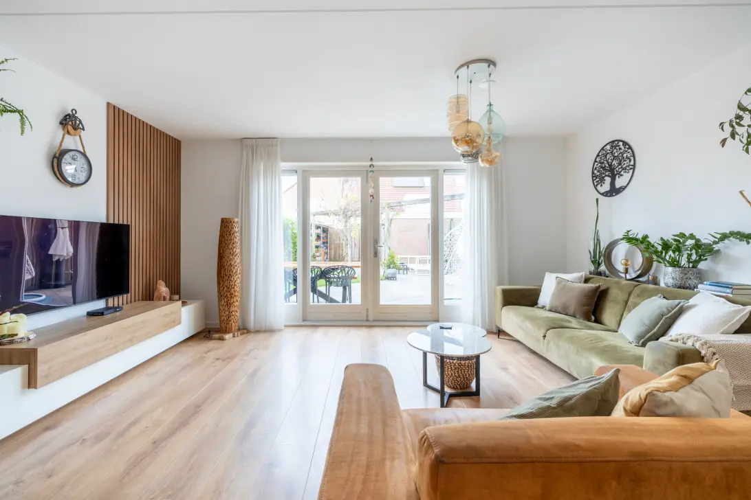 De woonkamer is tuingericht en heerlijk licht dankzij de openslaande deuren en de grote raampartijen. Wordt het toch wat te zonnig? Dan is er een zonnescherm uit 2018.