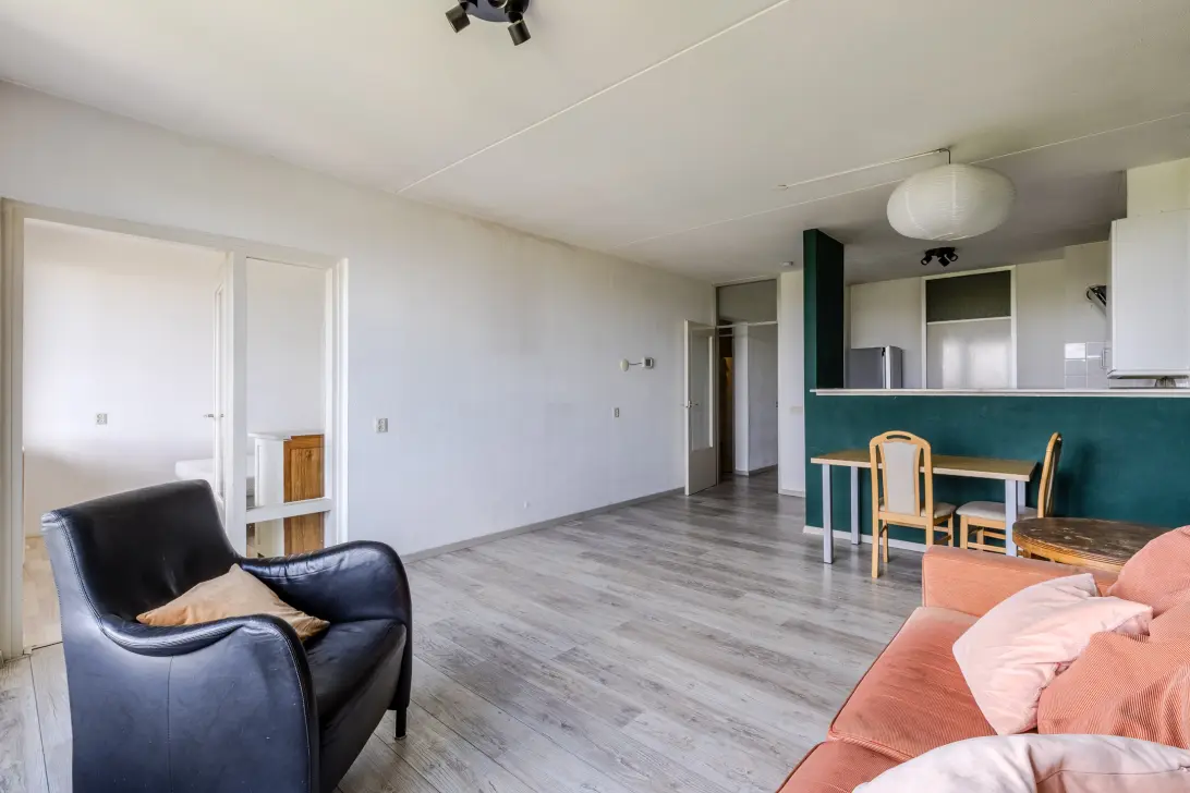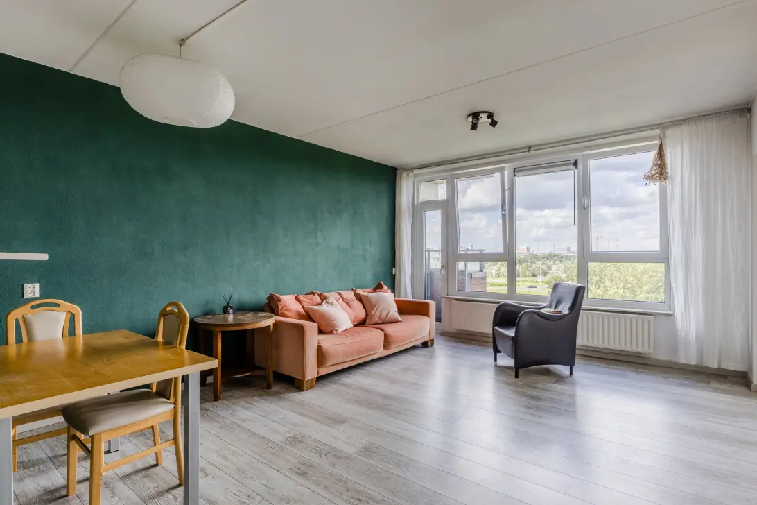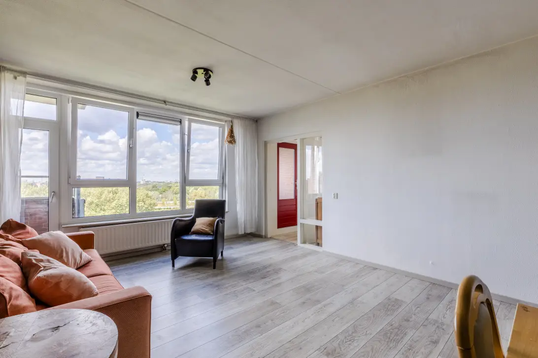 Entrance with elevator, apartment entrance on the 8th floor, hallway with access to the living room with open-plan kitchen and access to a spacious indoor storage room. The refrigerator and gas stove with oven and extractor hood can be left behind.Ideal for use as a utility room or walk-in closet. The living room offers a phenomenal view of Nelson Mandela Park, with views over Zuidoost and Amsterdam's city center. A spacious bedroom with access to the balcony. The second bedroom is at the rear. The bathroom has a bathtub, vanity, and connections for a washing machine and dryer. The current washing machine can be left behind. There is a separate toilet with a hand basin. The second bedroom is at the rear.