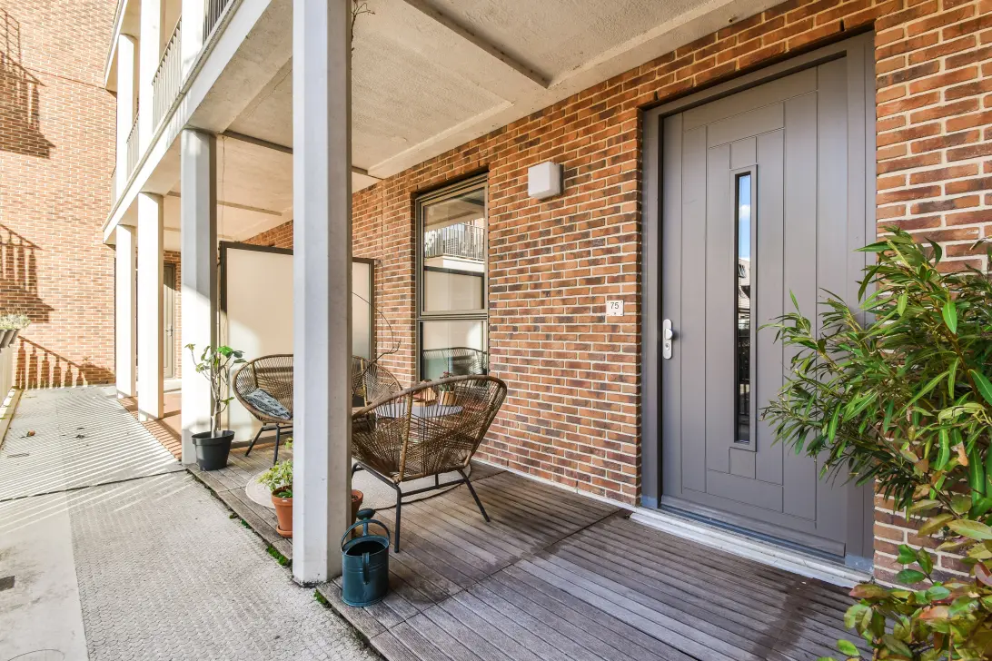 Direct naast de entree van de woning is het zonnige privéterras op het zuiden. Hier kun je heerlijk genieten van de middag- en avondzon met uitzicht op het rustige binnenterrein van het complex. Op de begane grond bevinden zich bovendien een eigen berging en een privéparkeerplaats op het afgesloten binnenterrein.