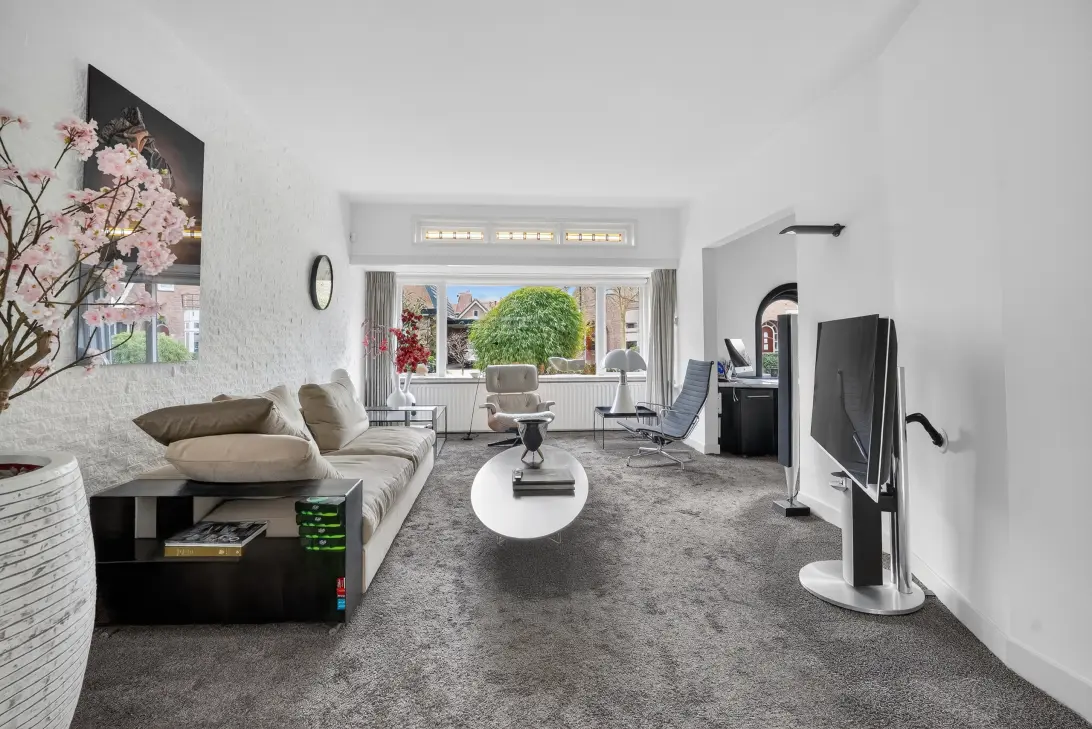 Vanuit de hal leidt een deur naar de woonkamer. De living is heerlijk licht en beschikt over een riant zitgedeelte. Een fraai detail zijn de glas-in-loodraampjes met daaraan grenzend een ensuite, die momenteel in gebruik is als kantoor. Aan de voorzijde bevindt zich een charmant ovaal raam met uitzicht op de straat.