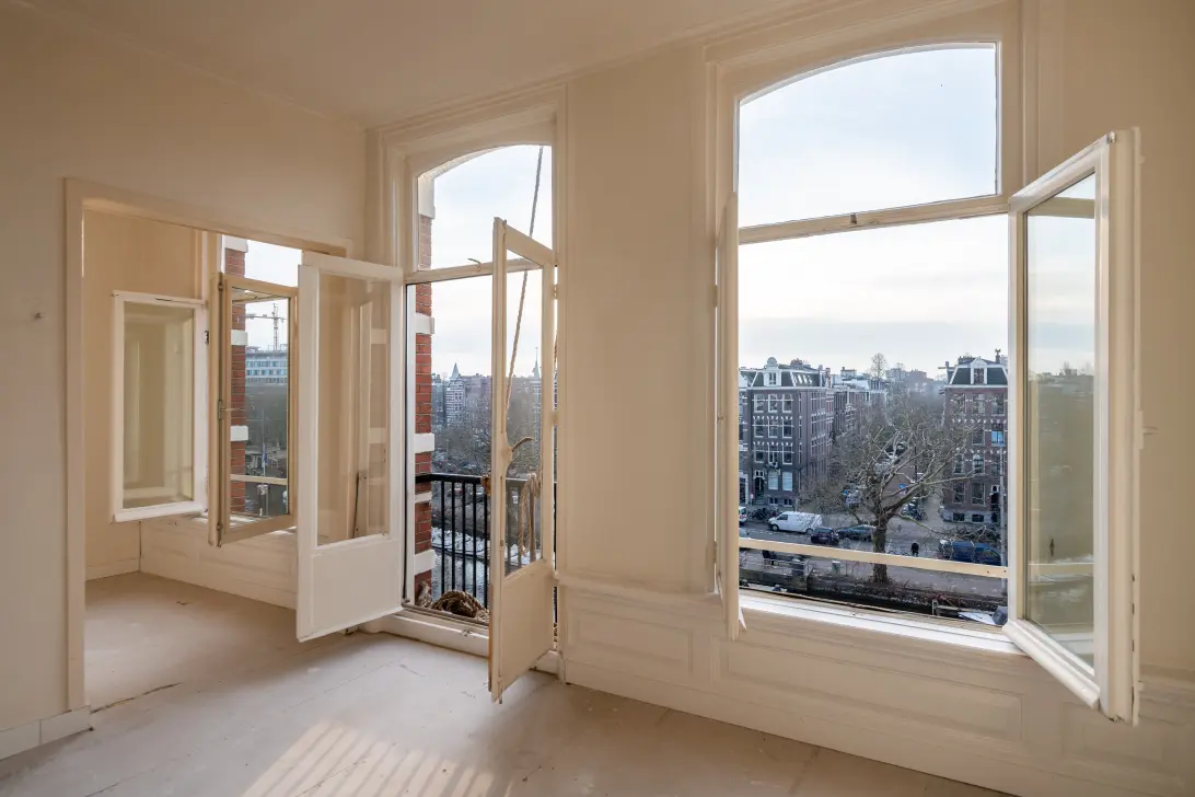 Located on the most beautiful part of Leidsekade and very sunny, the living room faces southwest on the canal.