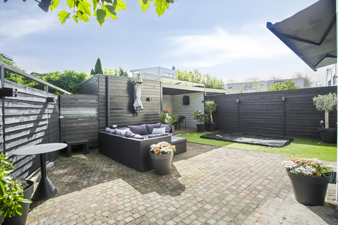 In deze modern aangelegde tuin kunt u al vanaf de ochtend van de zon genieten. Aan de achterzijde staat een houten schuur en een overkapping waar u tot in de late avonduurtjes kan tafelen. De achtergevel is voorzien van een elektrisch zonnescherm. De kinderen zullen in deze tuin fijn buitenspelen door de grote trampoline en een kunstgras speelveld voor hockey en voetbal.
