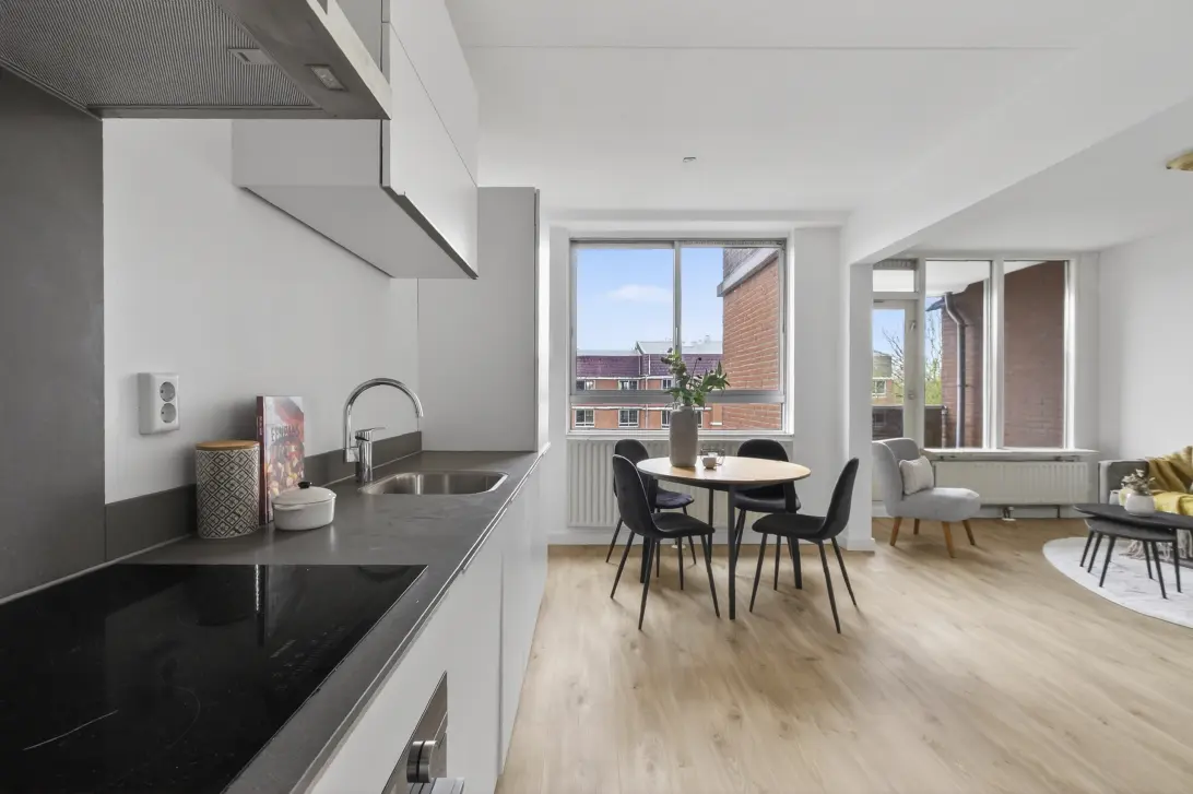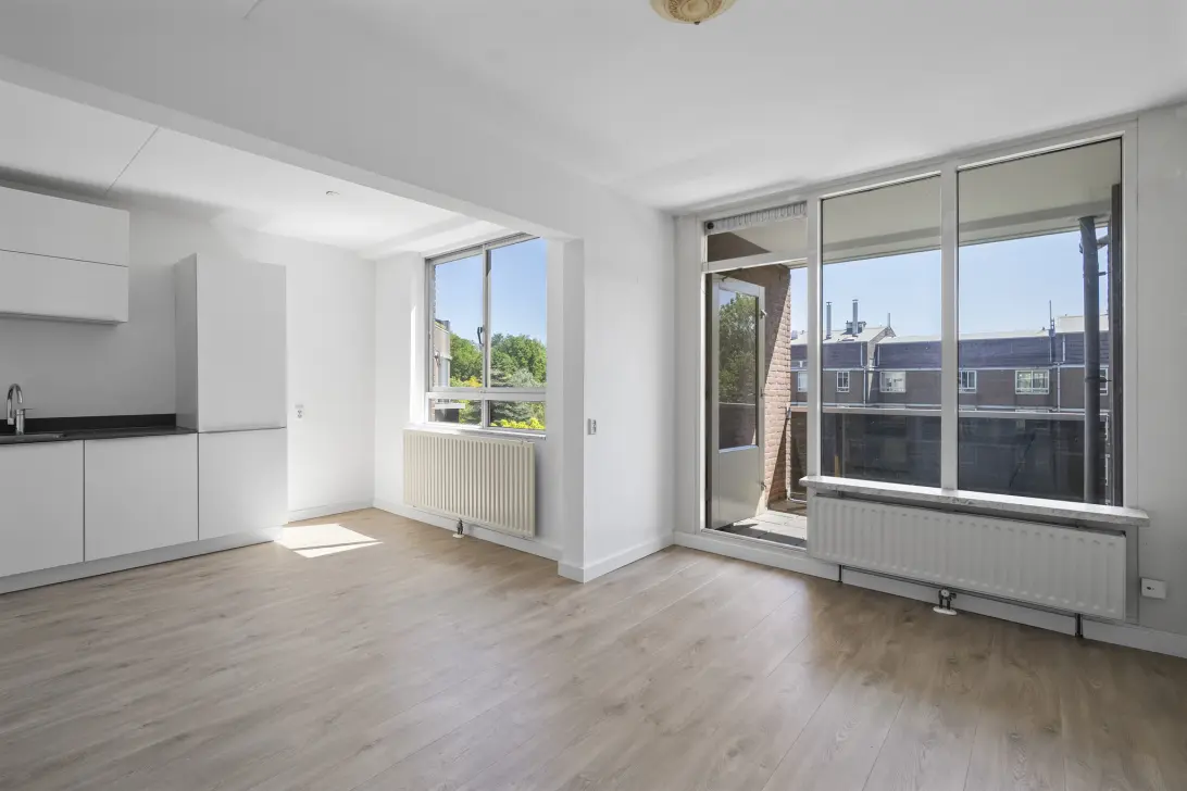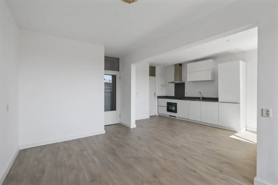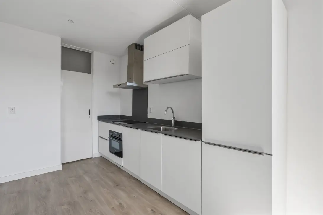 Entree woning, hal, meterkast, separaat toilet met fonteintje, woonkamer met open keuken. De open keuken is voorzien van diverse inbouwapparatuur. Vanuit de woonkamer heb je toegang tot het balkon die op het zuiden ligt.