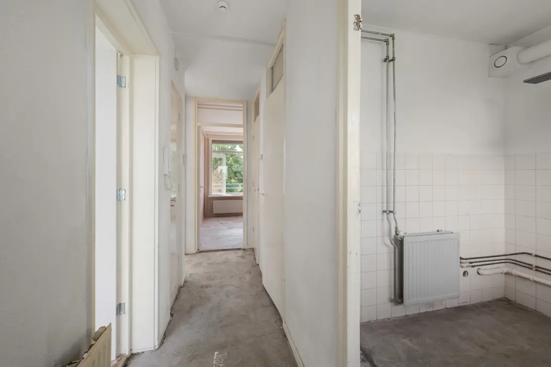 Entree, hal met meterkast en toegang tot alle vertrekken van het appartement; ruime slaapkamer (ca. 11,5 m²) aan de voorzijde; aan de rechterzijde bevindt zich de compacte keuken v.v. standaard keukenblok; toilet apart met daarachter de cv-ketel; badkamer v.v. wastafel en inloopdouche; aan de achterzijde de mooie lichte woonkamer dankzij de ligging op het zuiden, met een toegang tot het zonnige balkon; de tweede slaapkamer (ca. 11 m²) met tevens een toegang tot het balkon.