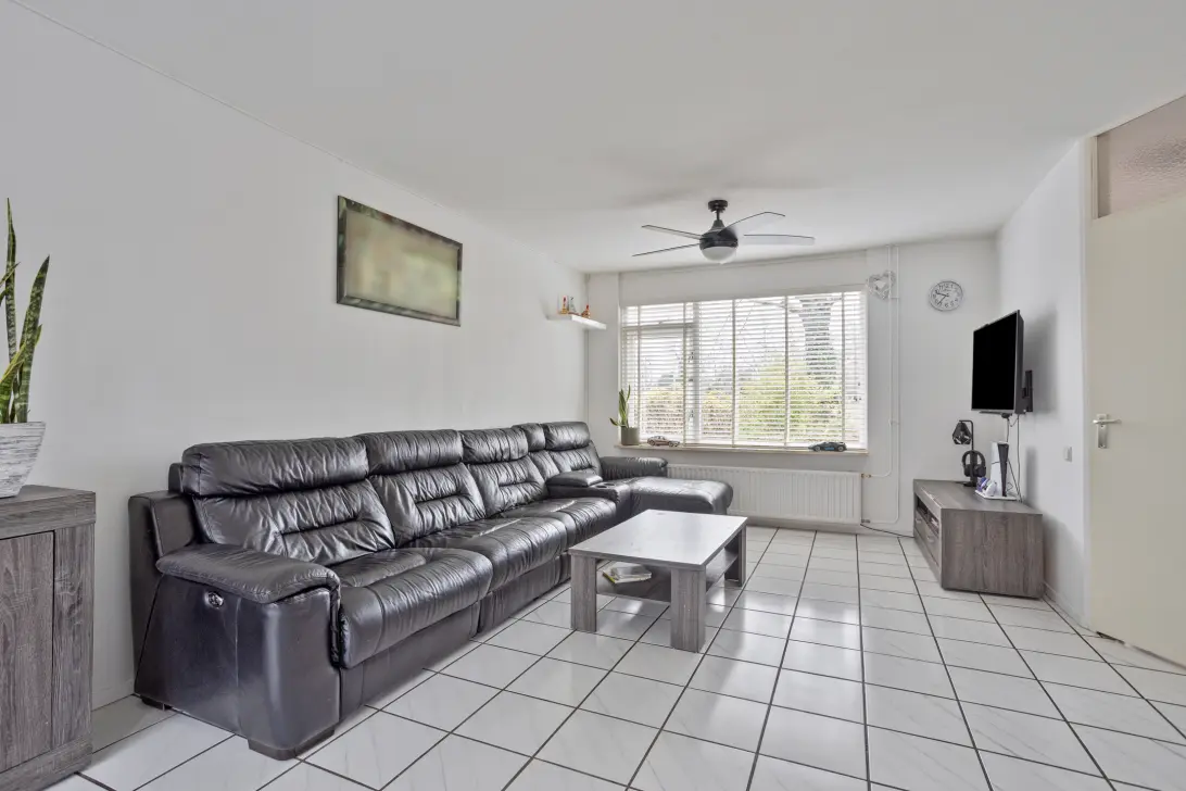 Stap binnen via de entree waar je meteen de meterkast en een toegankelijke hal tegenkomt die leidt naar de lichte woonkamer. Hier valt je oog op de stijlvolle plavuizenvloer en de centrale trapopgang die naar de bovenverdieping leidt. Daarnaast vind je een praktische tussenhal met toegang tot het toilet en een handige bergruimte.