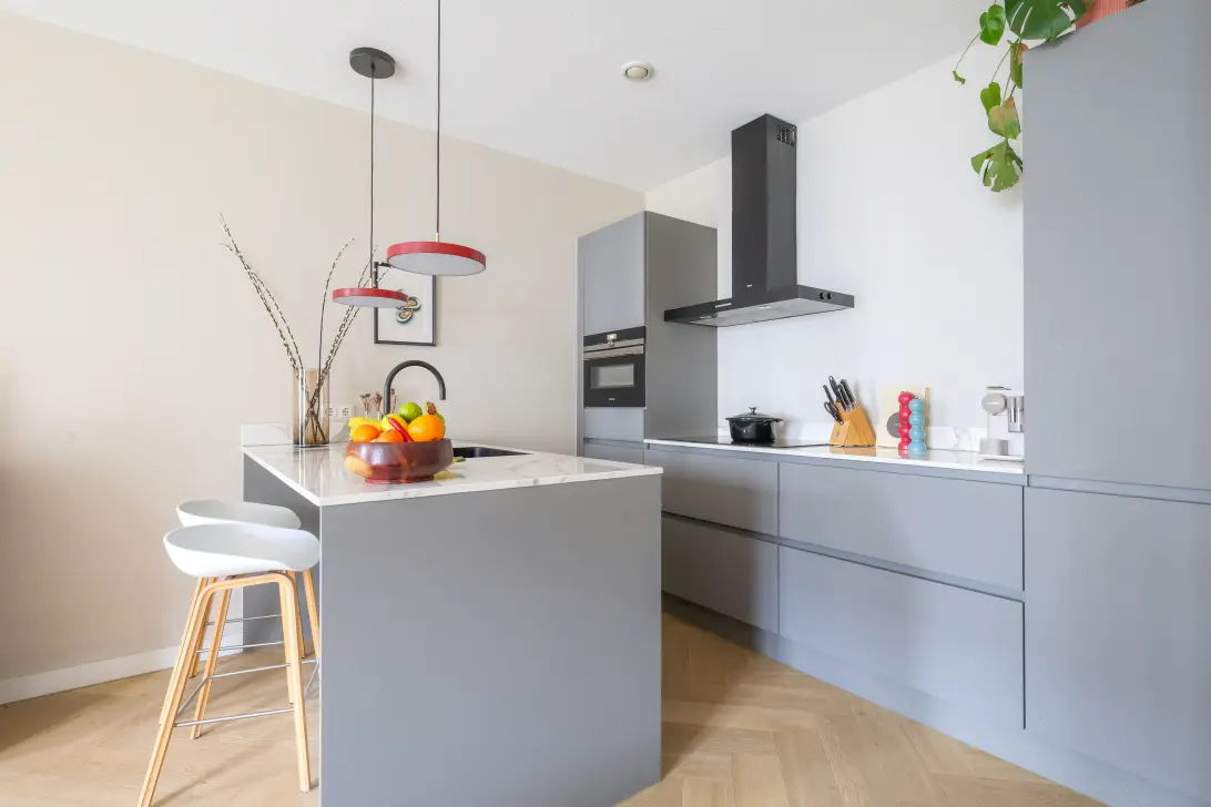 De keuken is een echte eyecatcher. Veel bergruimte, een schiereiland met een toffe bar en afgewerkt met een stijlvol werkblad. Hier kook je niet alleen, hier lééf je.